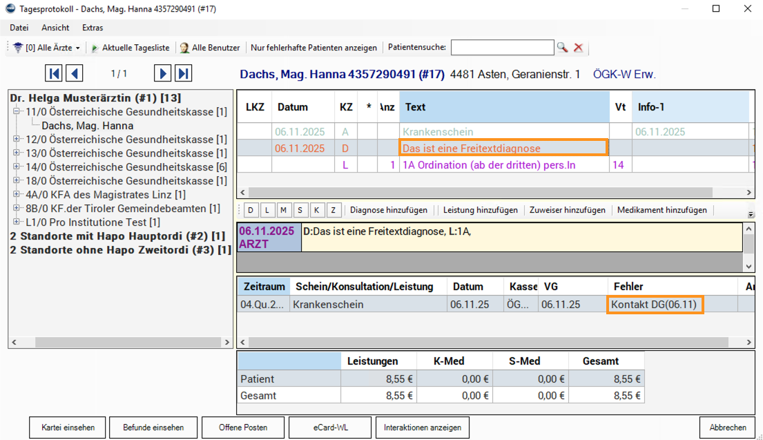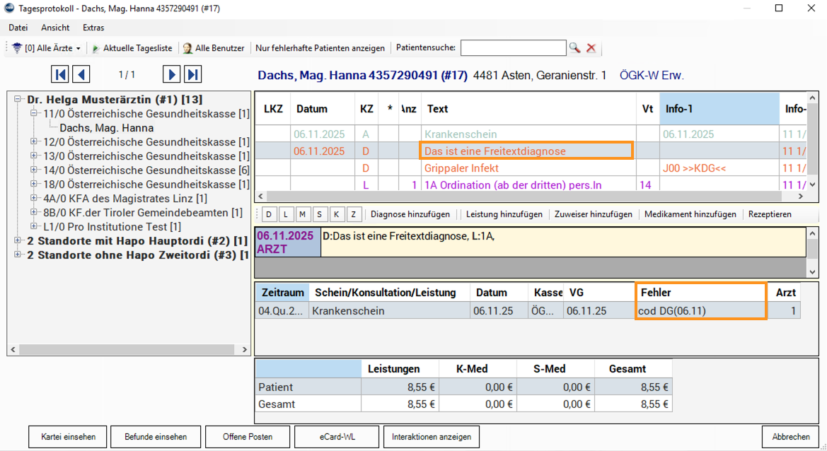 An einem Tag, an dem eine abrechenbare Leistung erfasst wurde, liegt nur eine Freitextdiagnose vor – diese wird im Kontrolllauf entsprechend hervorgehoben.