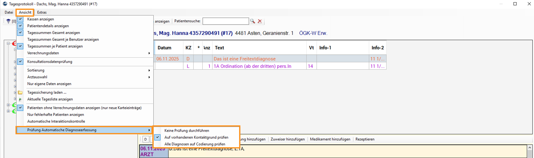 In den Einstellungen des Tagesprotokolls (PCPO Hauptmenü → Tagesprotokoll → Menü → Ansicht →Prüfung Automatische Diagnosencodierung) kann festgelegt werden, ob – und in welchem Detailgrad – eine Prüfung auf codierte Diagnosen erfolgen soll.