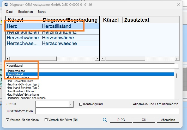 Beispiel: Sie haben ein Kürzel "Herz" für die Diagnose "Herzstillstand" angelegt.