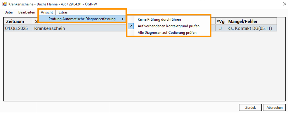 Die Prüfung auf codierte Diagnosen kann im Prüfungsfenster „Krankenscheine / Datenprüfung“ über das Menü „Ansicht → Prüfung automatische Diagnoseerfassung“ konfiguriert werden.