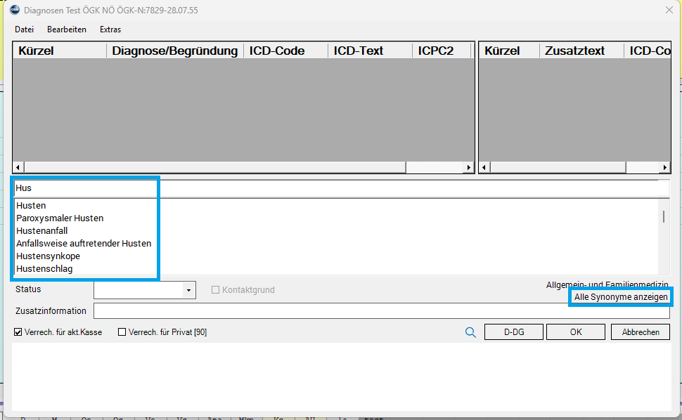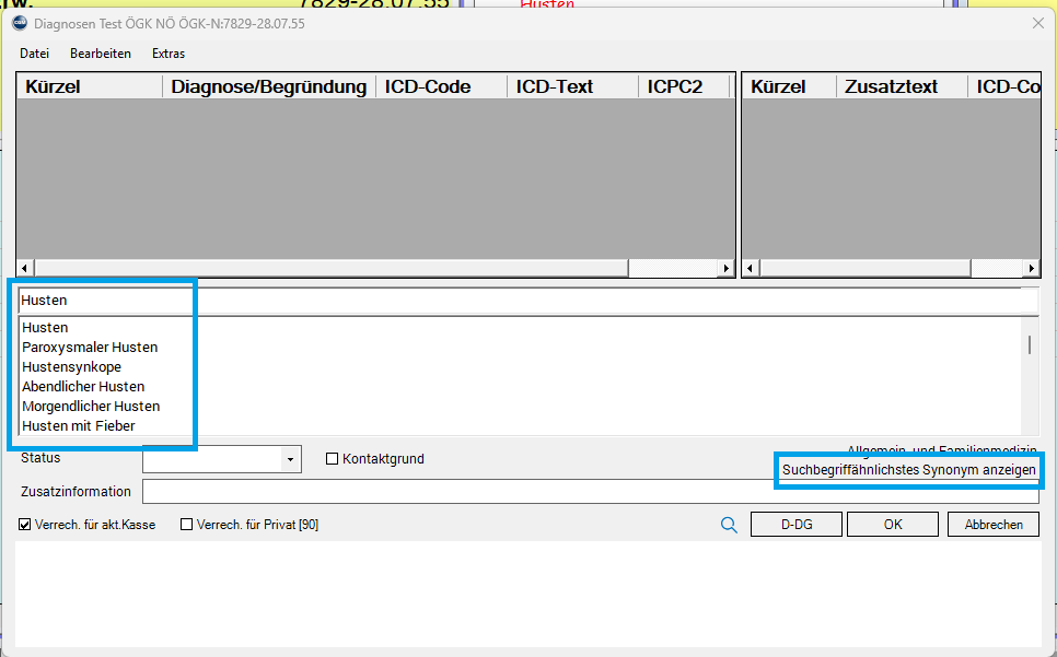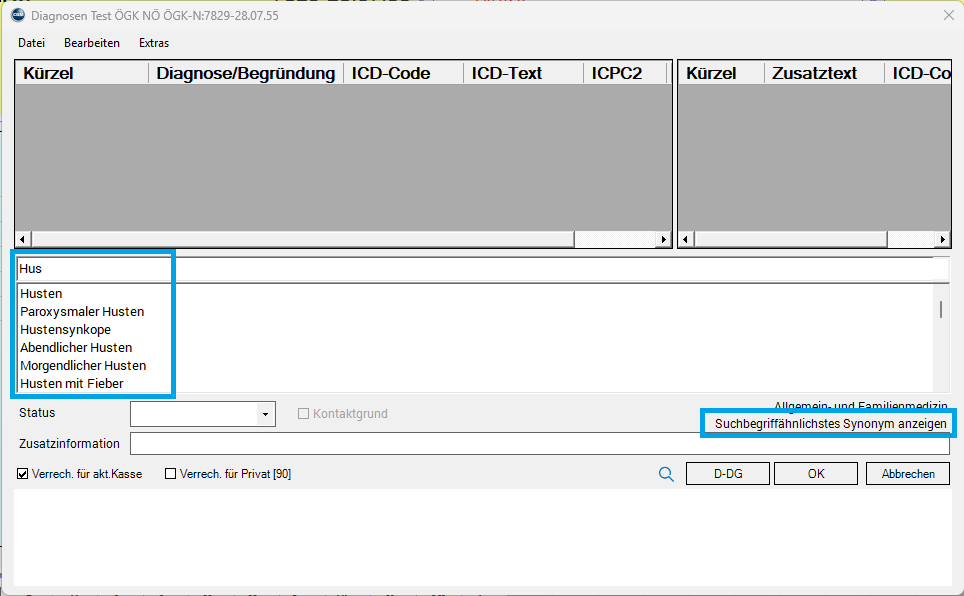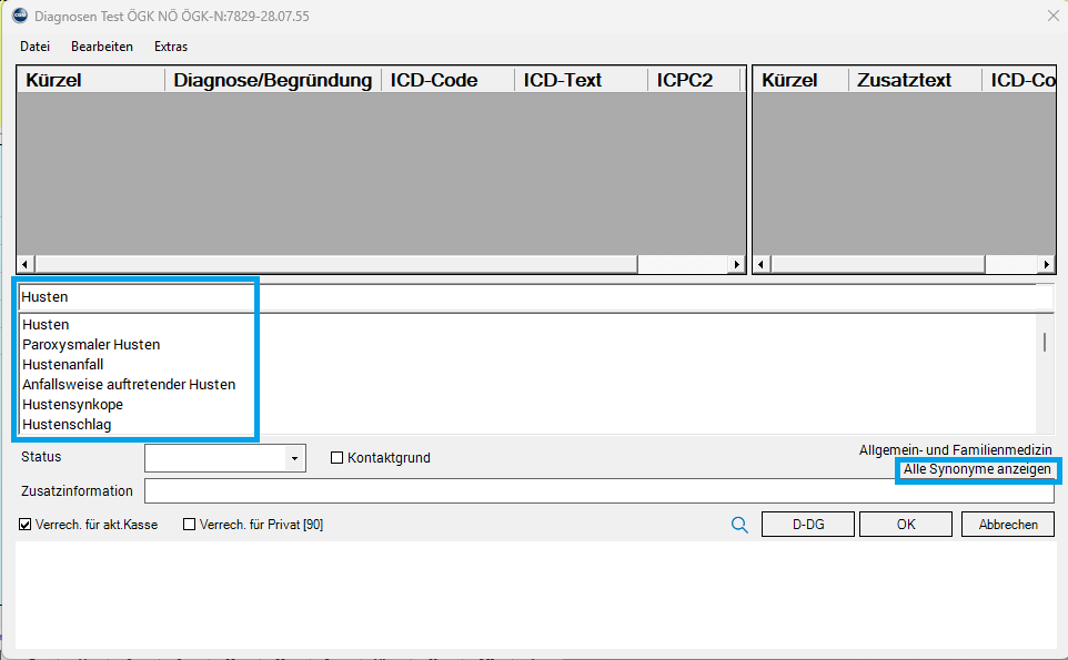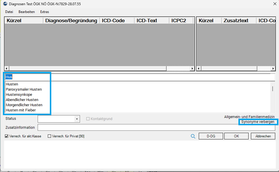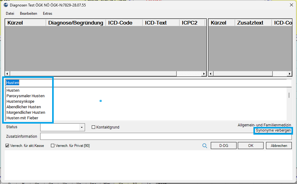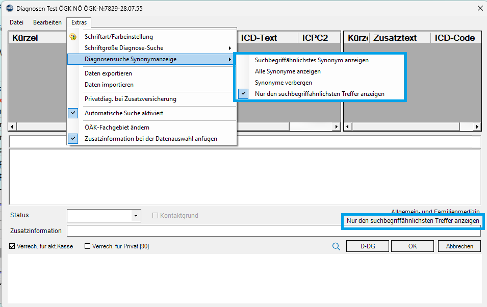 Die Einstellung kann jederzeit über den Menüpunkt Extras → Diagnosensuche Synonymanzeige angepasst werden.