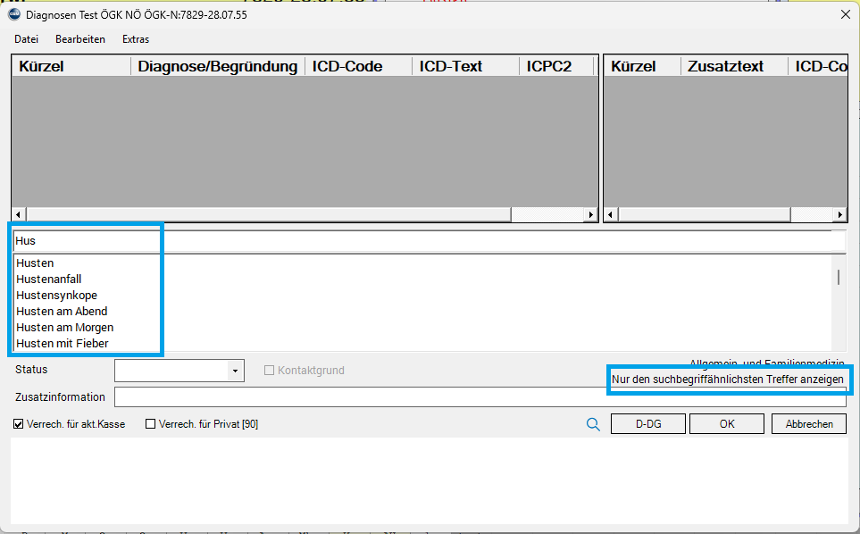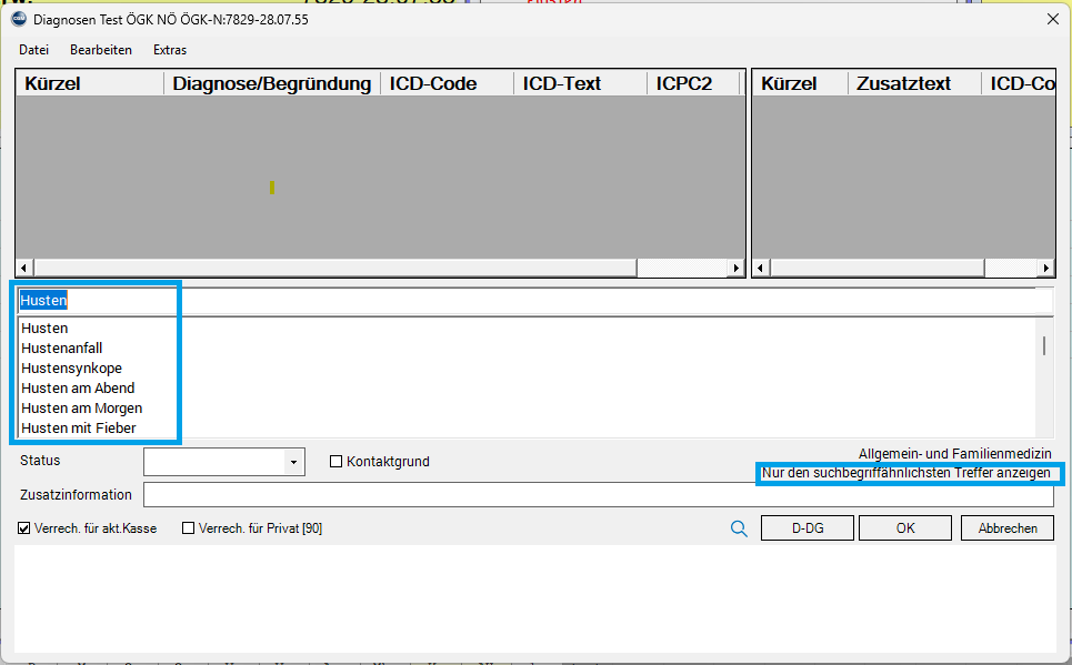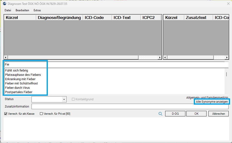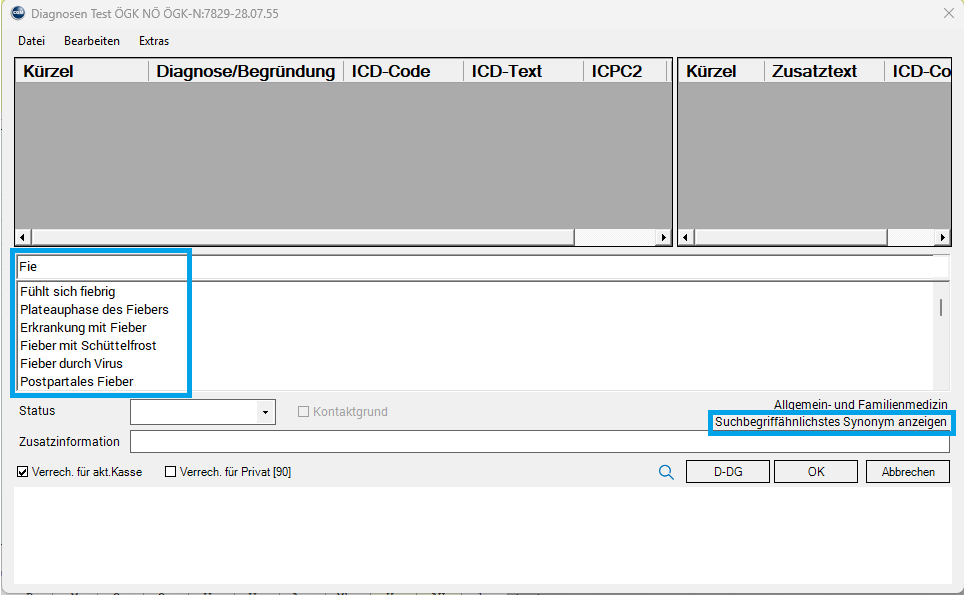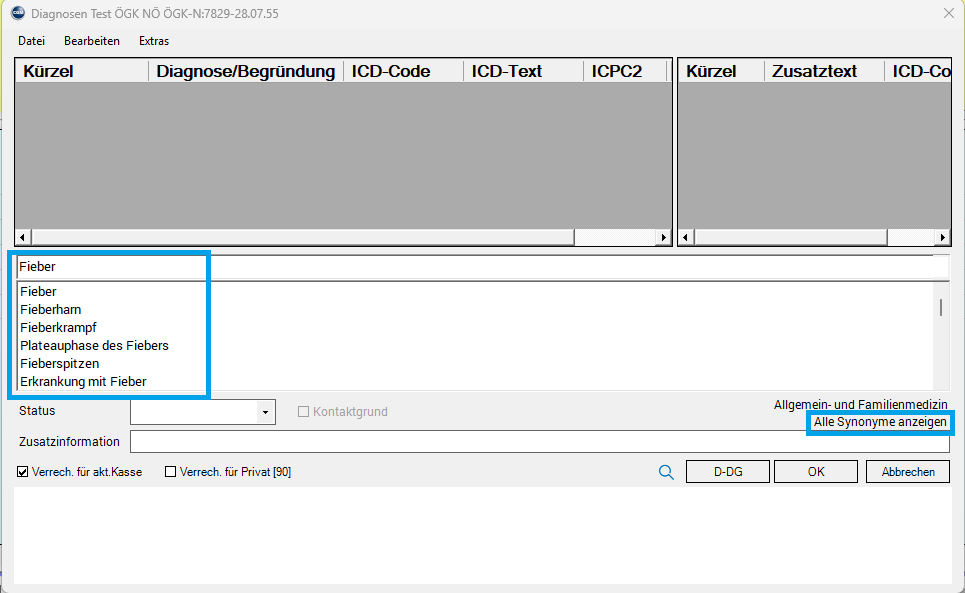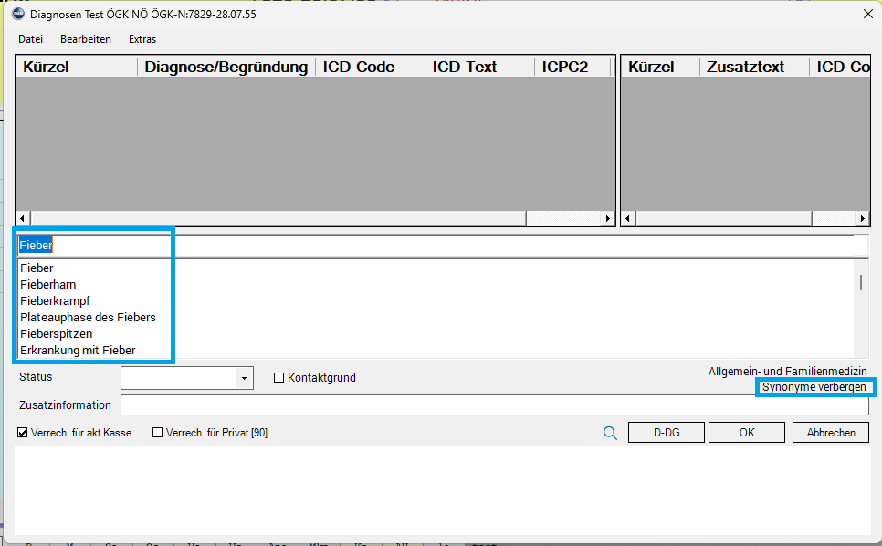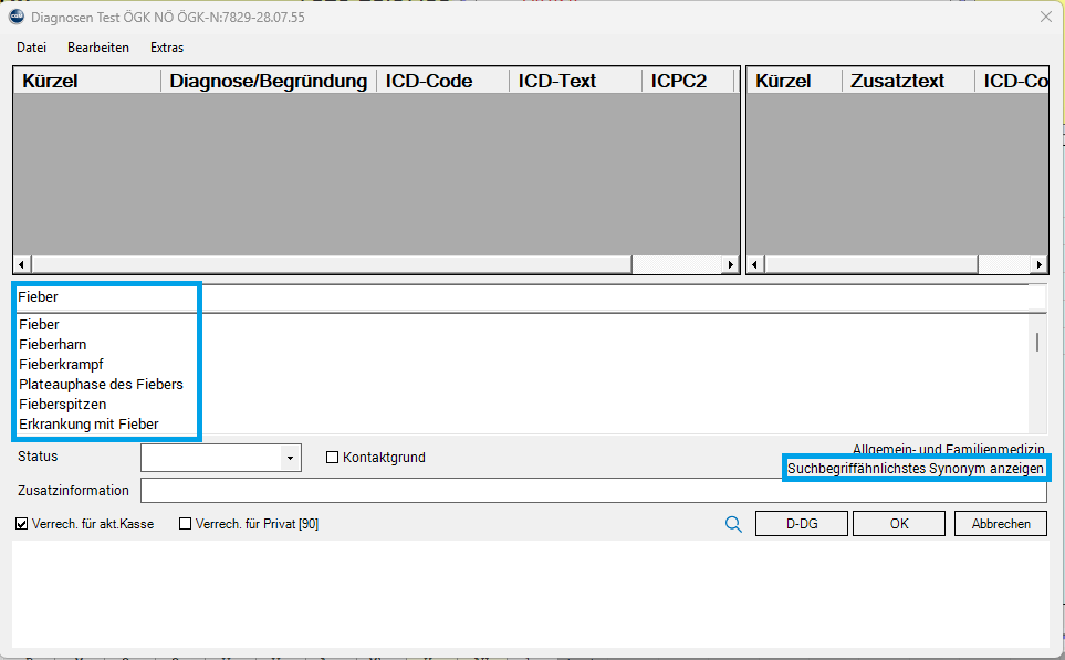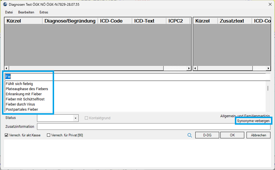 Die Einstellung kann jederzeit über den Menüpunkt Extras → Diagnosensuche Synonymanzeige angepasst werden.