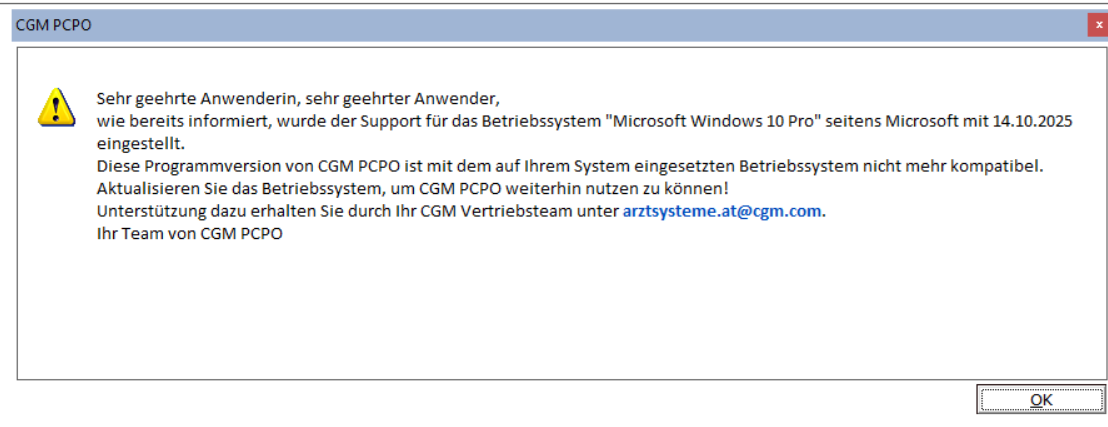Nutzer, die ein nicht mehr unterstütztes Betriebssystem einsetzen, sehen beim Start von CGM PCPO eine entsprechende Meldung.