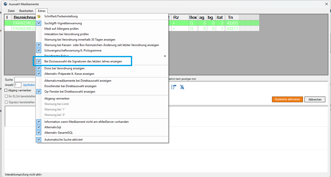 Die Einstellung wird über den Menüpunkt Extras → Bei Dosisauswahl die Signaturen des letzten Jahres anzeigen aktiviert.