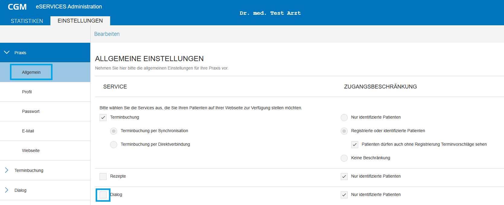 Damit Patienten nicht auf Antworten warten, empfehlen wir, die Funktion in der eService Administration zu deaktivieren.