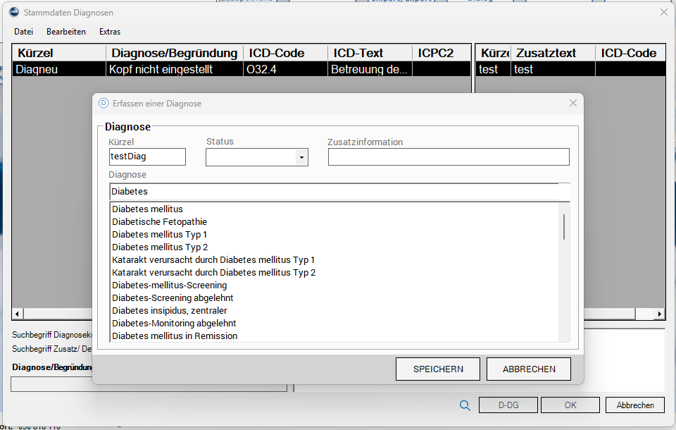 Neue Diagnosekürzel können wie gewohnt im Diagnosen-Fenster unter Bearbeiten → Erfassen angepasst werden.