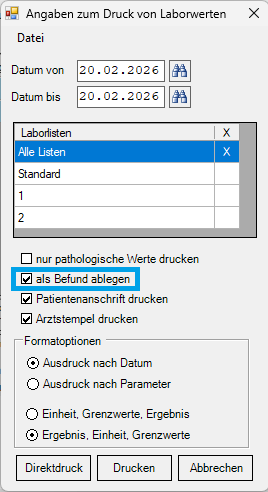 Beim Klick auf Druck in der Laborliste kann nun anstelle des Ausdrucks die Option Als Befund gewählt werden.