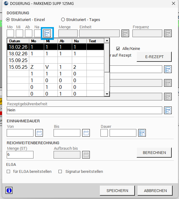 Seit dieser Programmversion können bei der Dosiseingabe über die Lupe direkt die zuletzt verwendeten Signaturen angezeigt werden.