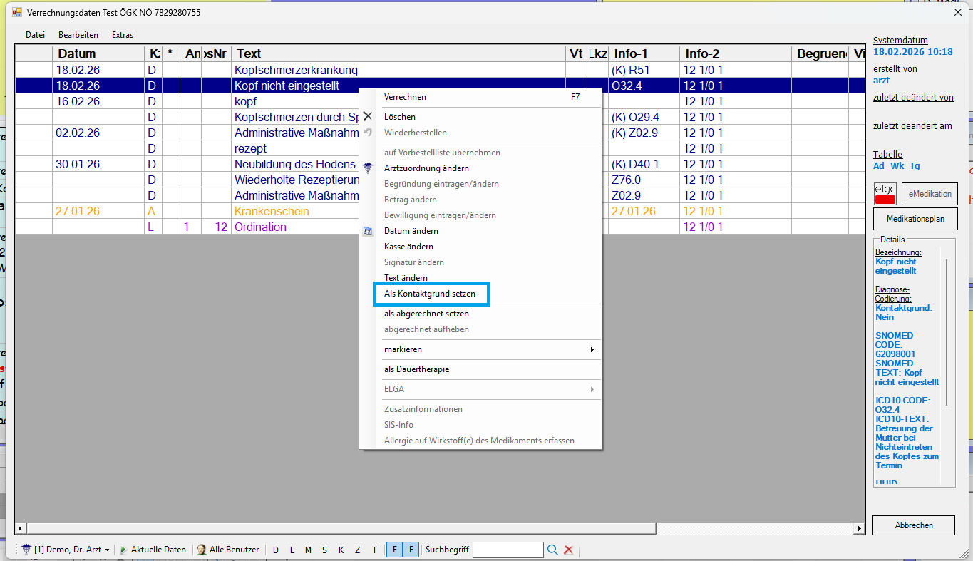 Mit dieser Programmversion kann in den Verrechnungsdaten eines Patienten nun per Rechtsklick auf eine Diagnose diese als Kontaktgrund gesetzt werden.