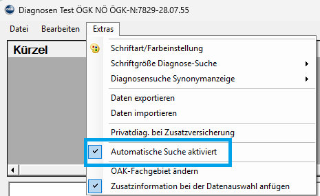 Die automatische Suche im Diagnosen-Fenster wurde standardmäßig aktiviert.